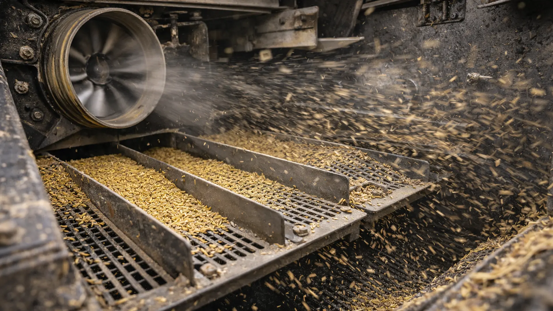 Sau khi trống đập hoàn tất quá trình tuốt hạt, công việc chưa dừng lại. Hỗn hợp lúc này gồm hạt lúa, trấu, rơm vụn và bụi sẽ được chuyển đến hệ thống sàng và quạt gió - bộ phận quyết định độ sạch của hạt trước khi vào thùng chứa.